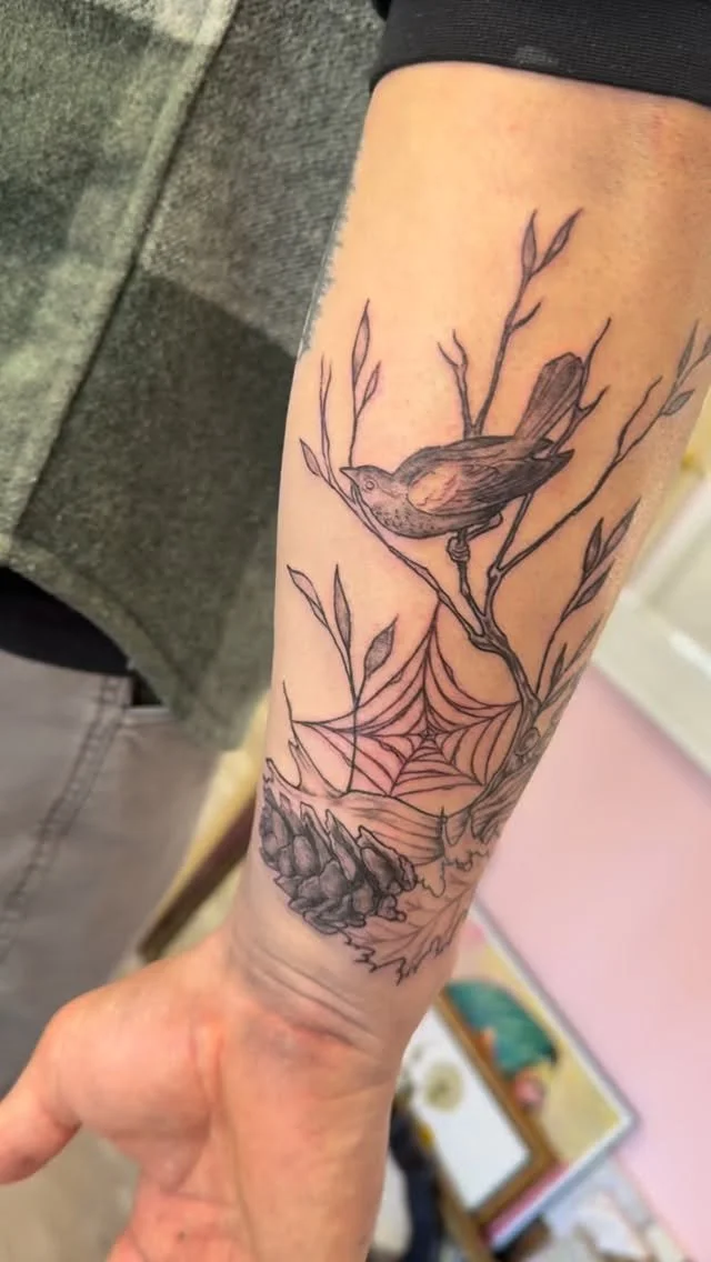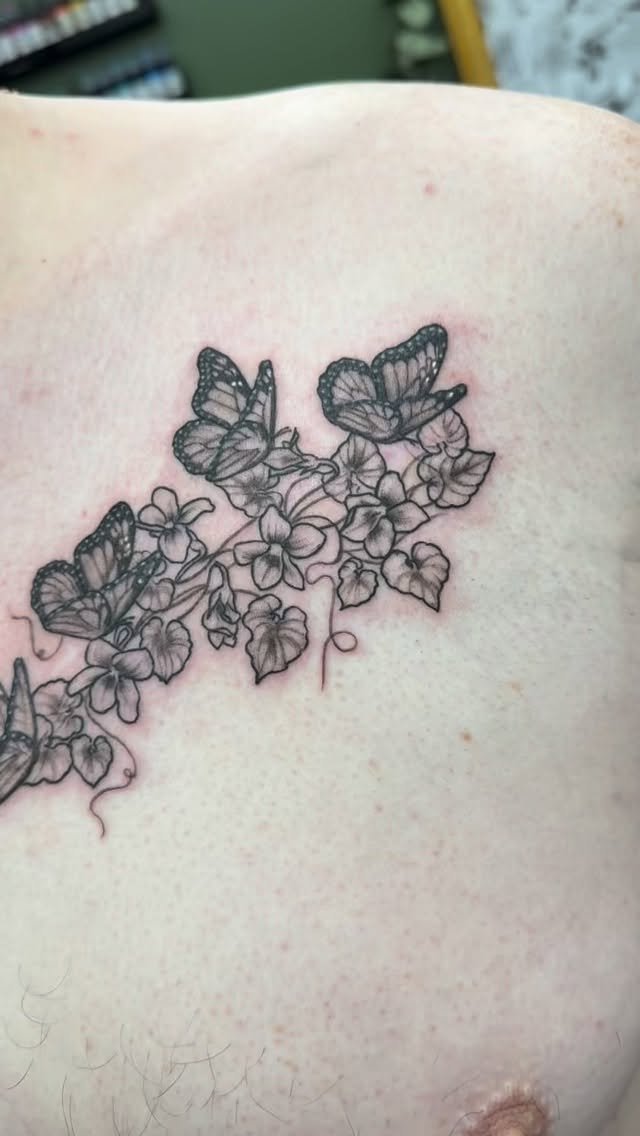I've been tattooing since 2023 and I specialize in soft black and gray realism, fine-line, semi-realism and illustrative pieces, bright painterly florals and botanicals, and bold neo-traditional designs. I love drama and detail, and my artwork leans both towards the creepy, gothic, and dramatic as well as bright and bubbly. I take pride in creating a clean comfortable environment where clients always feel welcome and wanted, and I'm always happy to work collaboratively with you to make sure your design is what you're looking for.