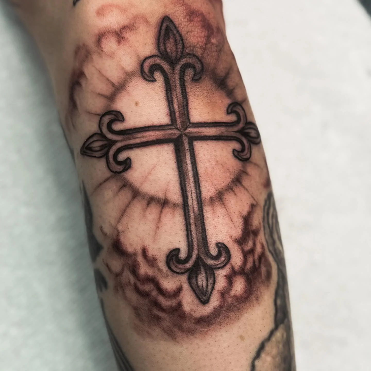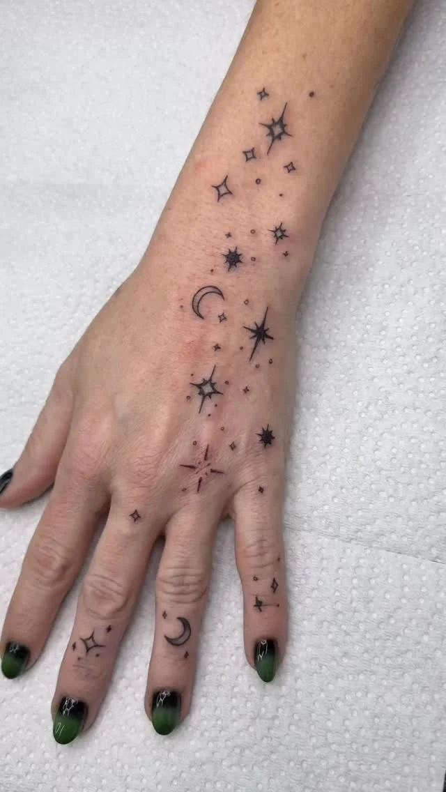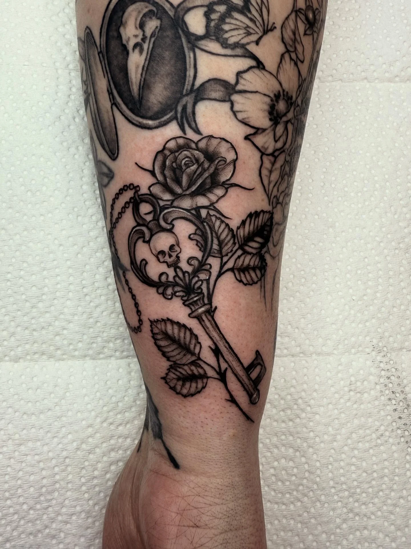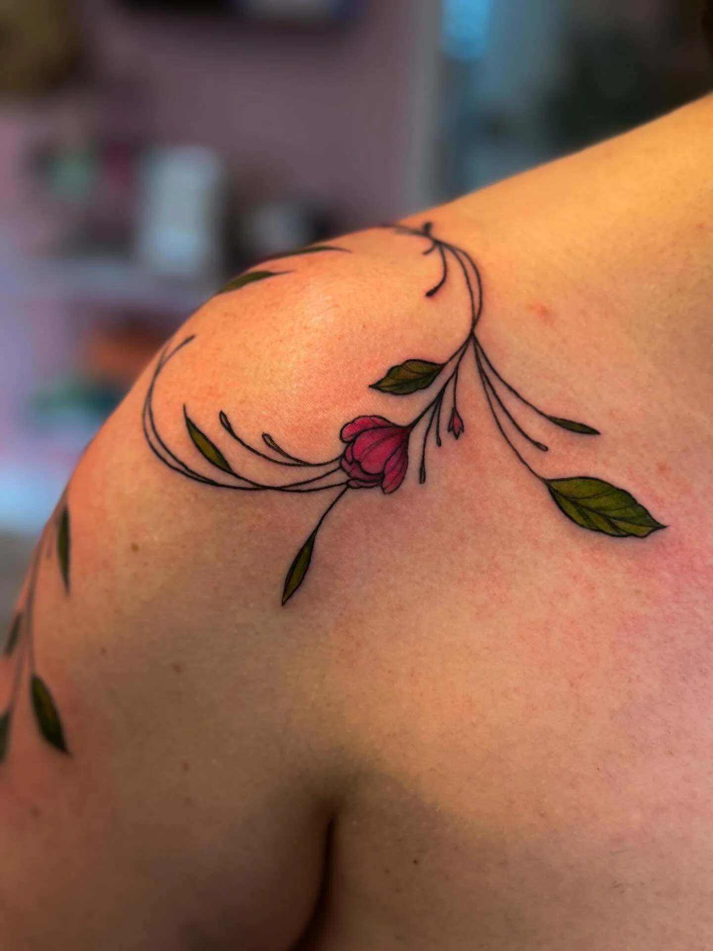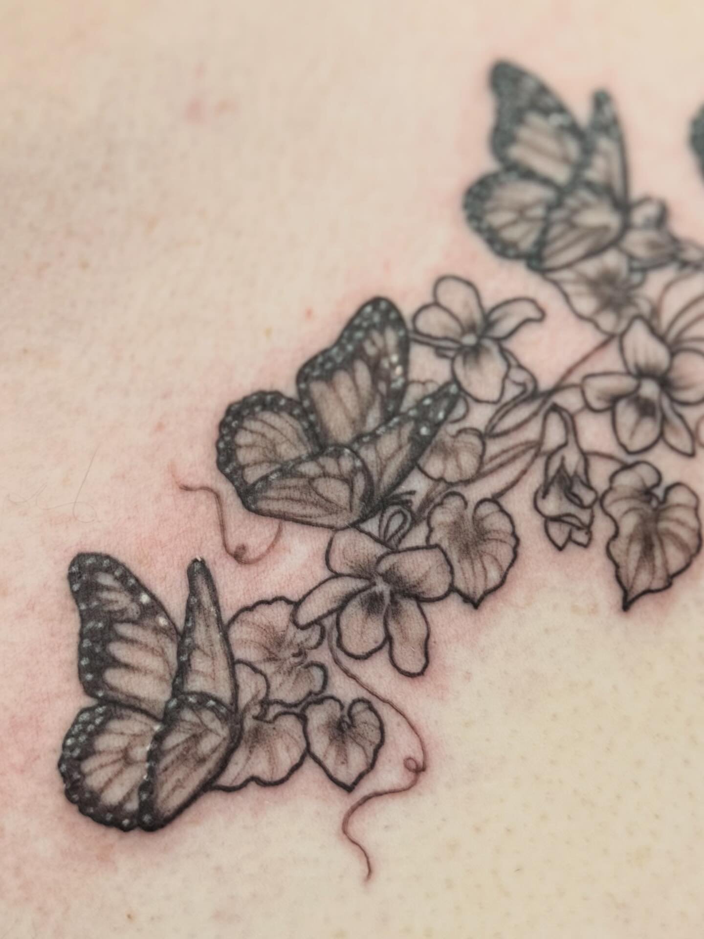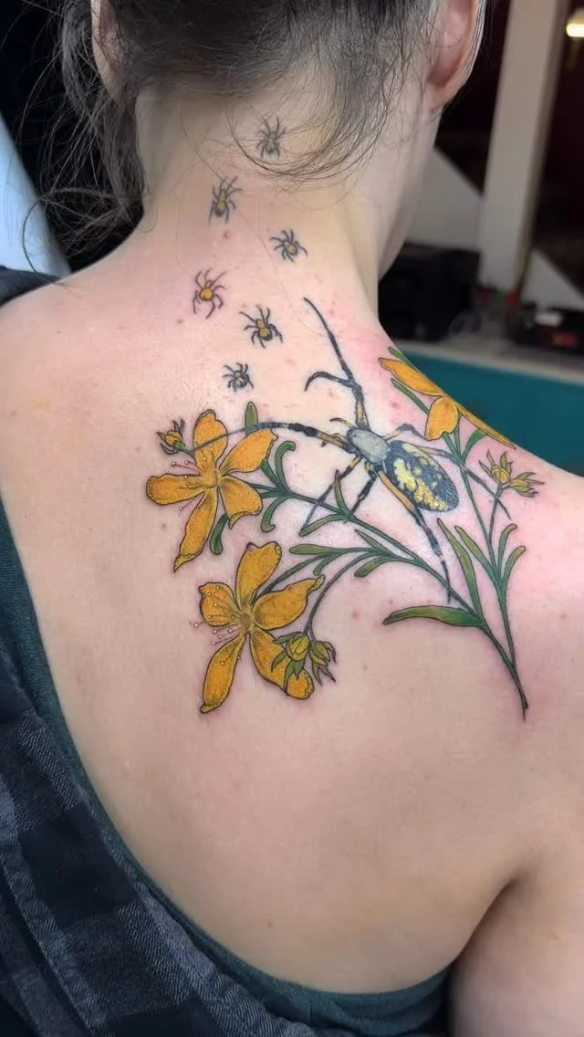 I've been tattooing since 2023 and I specialize in soft black and gray realism, fine-line, semi-realism and illustrative pieces, bright painterly florals and botanicals, and bold neo-traditional designs. I love drama and detail, and my artwork leans both towards the creepy, gothic, and dramatic as well as bright and bubbly. I take pride in creating a clean comfortable environment where clients always feel welcome and wanted, and I'm always happy to work collaboratively with you to make sure your design is what you're looking for.