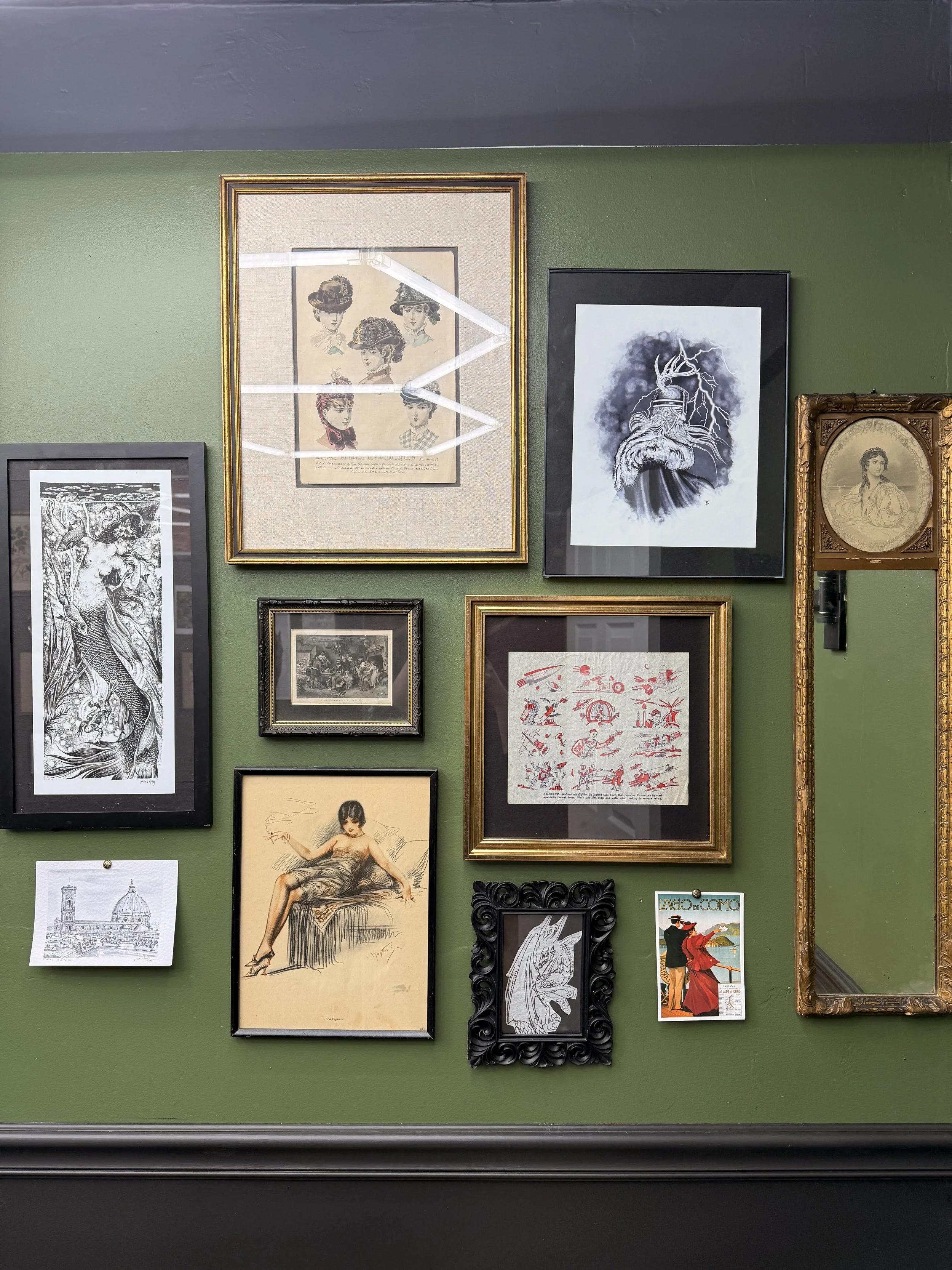 My workspace is a private room on the bottom floor of the studio - we have a large common area with natural light and plenty of flash designs, custom art, and crafts to check out!
